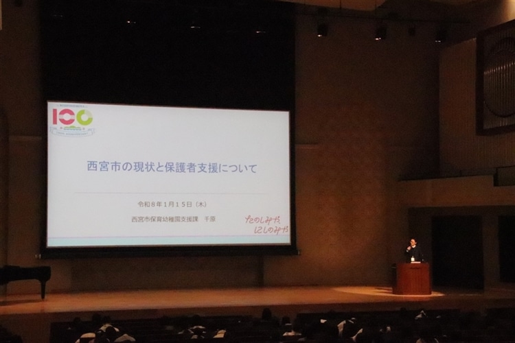 西宮市長より「西宮市のまちづくり」をテーマに、市の歴史や子育て世代を支えるまちづくりの取組・今後の展望についてお話しいただき、西宮市私立保育協会からは「西宮市の幼児教育・保育において大切にしていること」と題し、現場で大切にされている保育観や「遊び」を通した学びの重要性、保育者に求められる姿勢についてお話しいただきました。さらに、西宮市子ども支援局子育て事業部より、「西宮市の現状と保護者支援について」をテーマに、子育て家庭への支援制度や、就学後も見据えた切れ目のない子育て支援の取り組みについて講演をいただきました。